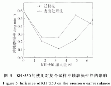 从图5中可以看到:不论KH-550以何种方式加入,使用量为多少,胶粘涂层的耐冲蚀磨损性相比未加入KH-550时都得到一定的提高,并且复合试样的耐磨性在胶体具有高粘接强度时较好,其中8号试样(迁移法KH-550量为3.3%)的冲蚀磨损率*,为0.11mg/min,1号试样(KH-550量为0%)的相对耐磨性达5.36。