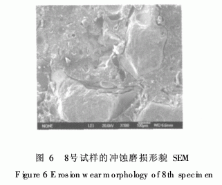 图6是8号试样在60°攻角下的冲蚀磨损形貌。从图中可以看到,在石英砂粒子的水平切削及垂直冲击作用下,胶体与碳化硅颗粒界面虽有少许疲劳裂纹,但SiC颗粒仍牢牢镶嵌在胶体固化物中而没有脱落,材料表面损耗较小,因而耐磨性较高。