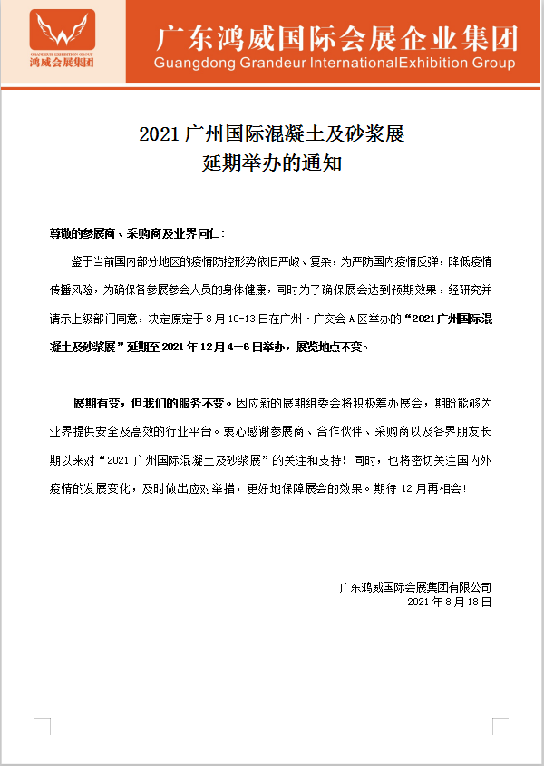 2021广州国际混凝土及砂浆展及砂浆展延期举办的通知