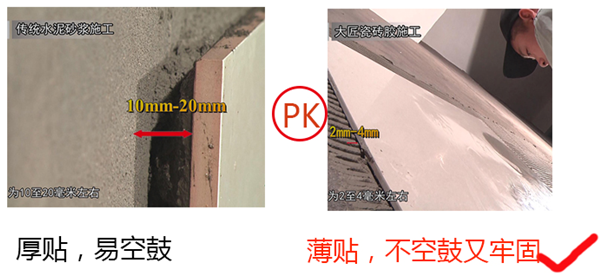 水泥砂浆须厚贴,材料量多、重,收缩性大,易造成瓷砖空鼓。