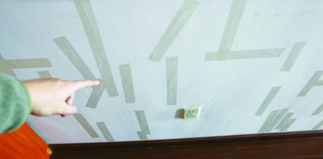 11月8日,记者来到望江西路幸福里小区赵先生的家,抬头可见墙上一大块“伤疤”,用一条条透明胶布粘着,胶布下面则是张了嘴的墙皮。“要不用胶布粘,就怕整块漆面掉下来。”赵先生说。他是2013年4月份买的二手房,当时是毛坯。在他与北京百度建筑装饰工程安徽有限公司签订的合同协议上可以看到,开工日期为2013年5月7日,45天完工。