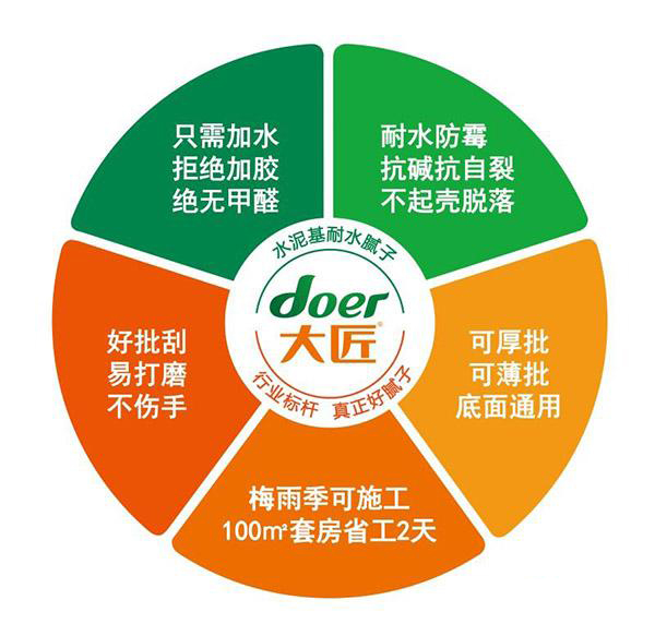 大匠水泥基腻子引进德国耐水防霉技术,采用完全无毒的配方,标准化生产,产品质量稳定可靠,符合国际环保标准。其超强的耐水性和抗自裂性,能适应各种潮湿多雨的气候环境,现如今已成功领跑国内耐水腻子产品18年,成为业主装修时的首选基材。