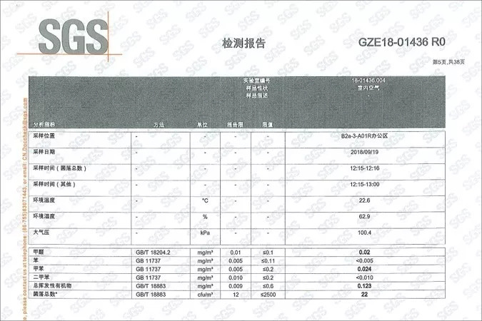 国内知名智能终端品牌在深圳的办公大楼在涂装了立邦工程内墙产品体系后,邀请国内领先的空气治理公司AY进行了专业空气净化,并特邀全球领先的检验、鉴定、测试、认证机构SGS对空气质量进行全面检测,结果全部达标。
