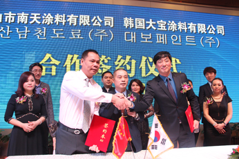 2月5日,中山南天涂料有限公司(以下简称“南天涂料”)与韩国大宝涂料有限公司(以下简称“韩国大宝”)在中山小榄举行了隆重的签约合作仪式。南天涂料董事长张铨秋、总经理祝燕弟、韩国大宝董事长李昌锡,及双方公司高层领导、南天涂料大连经销商李永强、律师刘值林共同参与见证,来自南天涂料经销商、供应商、公司员工、媒体约500人共同庆贺双方合作成功。
