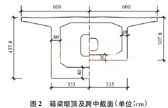 箱梁截面为单箱单室截面变高度、变截面结构,箱梁顶板宽12. 0m,厚度除梁端附近外均为40cm,底板宽6. 7m,厚度为40 ~ 80cm。腹板厚度为48 ~ 80cm,梁体采用C50 混凝土。如图2 所示。
