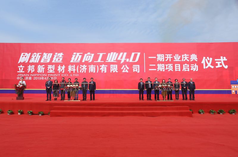 2019年4月26日,立邦新型材料(济南)有限公司一期开业庆典、二期项目启动仪式,在山东省济南新材料产业园隆重举行。济南市天桥区区委书记刘程华、济南市天桥区区委副书记、区长窦虎、济南市天桥区人大常委会主任刘建忠、济南市天桥区政协主席樊瑞,济南市新材料产业园管委会主任赵新生、中国建筑材料联合会预拌砂浆分会秘书长郭晞、立邦中国建筑涂料事业群生产供应链高级副总裁邢荣华、生产供应链生产运营中心总经理陈红、中原区域公司副总经理陈子刚、工程事业部中原大区副总经理孟攀峰、生产供应链高级副总裁特别助理杨敏等领导出席仪式。