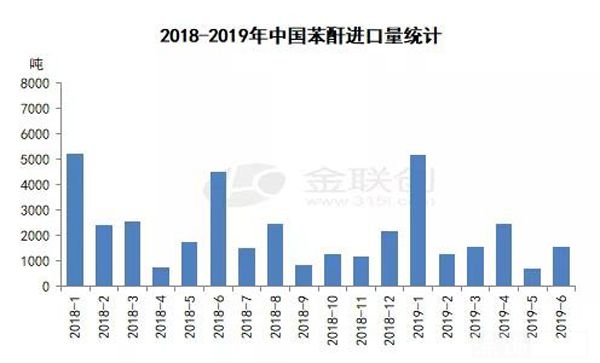 2019年上半年受制于下游需求疲软,国内市场价格下跌明显,我国苯酐进口数量出现下降。