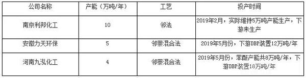 进口数量出现减少的主要原因是我国产能增加对于进口货源的冲击。2019年上半年我国苯酐产能共增加19万吨/年,具体投产装置见下表: