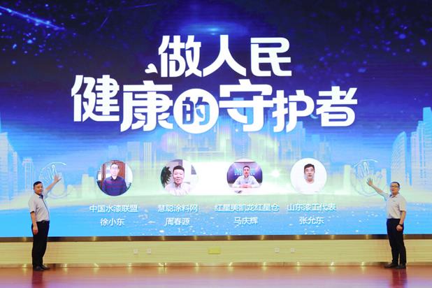 随着直播进展,迎来了激动人心的时刻——“做人民健康守护者”点亮仪式,仪式由晨阳水漆党委书记、执行总裁刘占川、品牌运营中心总经理马林、中国水漆联盟领导徐小东、红星美凯龙红星仓领导马庆辉、山东漆工代表张允东共同点亮。
