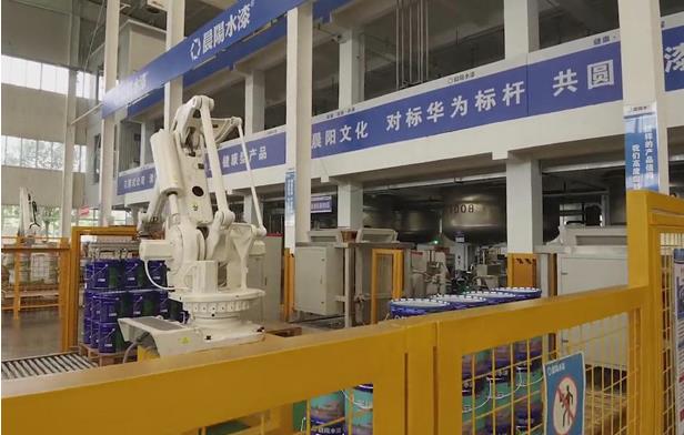 雄安西侧,荣乌高速旁,占地超千亩的晨阳水漆产业园内,数百辆大货车排成左右两排,车水马龙,长达千余米的运输路,一派红火忙碌的景象。加速水漆生产,全力释放产能,这个年产能125万吨,全球最大的全水漆智能制造基地被称为中国环雄安“绿色硅谷”。
