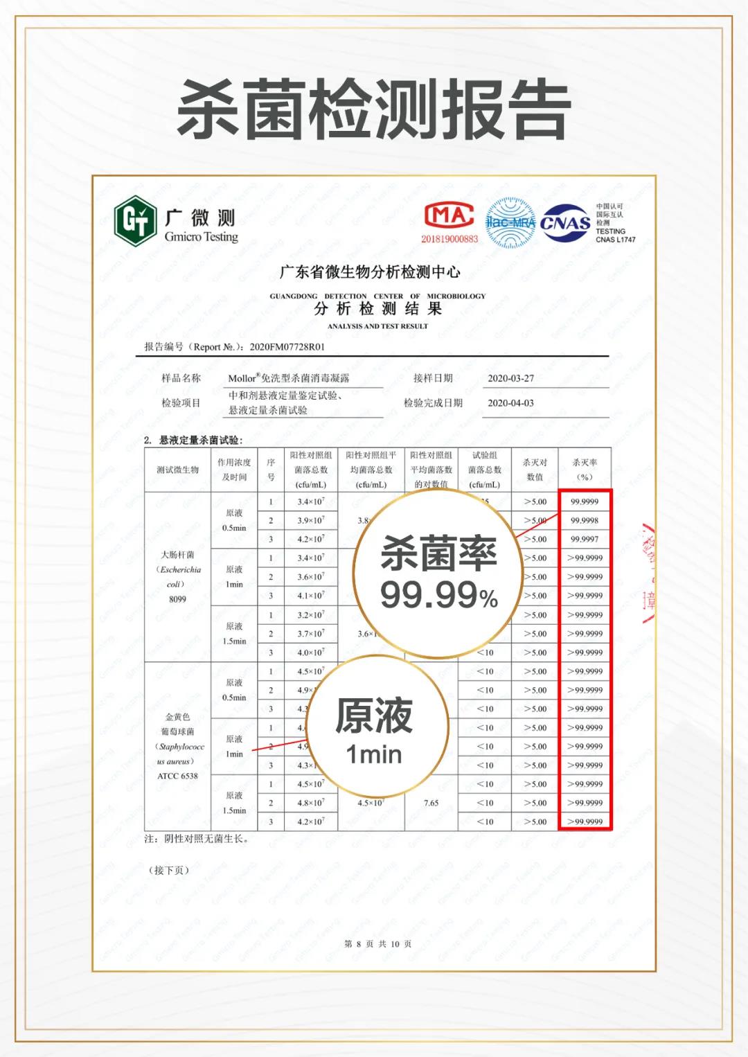 近期,国家卫健委发布的《新型冠状病毒肺炎诊疗方案(试行第七版)》中明确提到:75%乙醇可以有效灭活病毒。而嘉宝莉新推出的Mollor免洗型杀菌消毒凝露/消毒液,执行GB 26373-2010《乙醇消毒剂卫生标准》,其主要消毒成分是酒精,含量超75%,高效杀菌99.99%,能提供长效的保护作用。市面上“卫妆准字”批号的洗手液属于化妆品范畴,不具备杀菌、抑菌功效,只能起到一般清洁的效果。Mollor免洗型杀菌消毒凝露/消毒液荣获 【消字号】(粤卫消证字[2020]-13-第0009号),能有效杀灭或抑制常见致病菌,如大肠杆菌、金黄色葡萄球菌、白色念珠菌等。